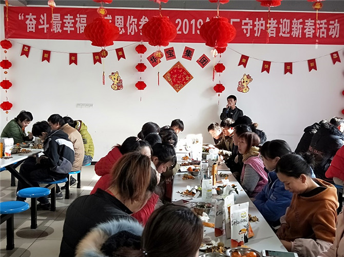 1月29日,華寶集團行政中心聯(lián)合黨工會以及積極參與的志愿者們?yōu)?019年留廠約60人的守護者舉辦迎新送溫暖活動,所有的志愿者都提前布置會場,拉彩旗、貼墻紙、掛燈籠、洗水果裝盤、分干果、包餃子以及維護現(xiàn)場持續(xù)等等,音樂響起來,吃著干果,話家常,善歌者唱歌,善舞著跳舞,活動現(xiàn)場氣氛熱烈,晚飯不僅有水餃還有紅燒肉,讓所有的參與人員及留守員工感受到家的溫馨、年的味道,幸福滿滿!