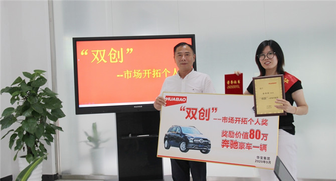 2020年9月29日,“雙創(chuàng)”--市場(chǎng)開(kāi)拓個(gè)人獎(jiǎng)授車儀式在華寶集團(tuán)隆重舉行。分管外貿(mào)的俞玲玲女士以突出的銷售業(yè)績(jī)獲此殊榮,獎(jiǎng)勵(lì)價(jià)值80萬(wàn)的奔馳豪車一輛。