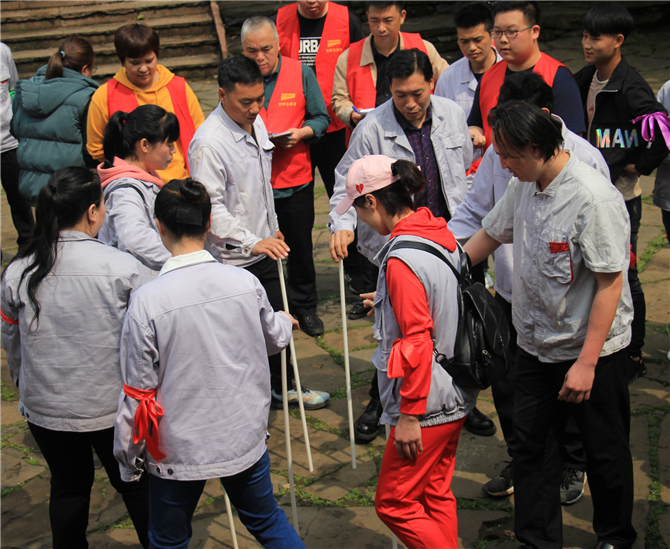 (不倒森林) 團隊成員圍成圈手握長桿垂直于地面,小組成員依次移動交換位置,長桿立于不倒,輪換完三遍,以用時最少為勝。